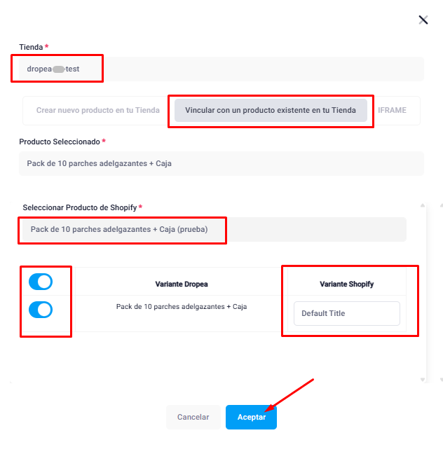 *Si el producto tiene variantes verás más opciones. Debes verificar que todas las que aparezcan estén activas (de color azul), pero en el campo "Variante Shopify" debes ir seleccionando la variante que corresponda a cada una. Para concluir, debes hacer click en el botón "Aceptar". Listo, el producto ya quedó vinculado a tu tienda.