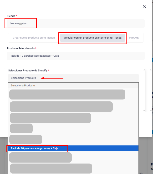 b) Si ya tienes el producto creado en tu tienda debes escoger la opción: "Vincular con un producto existente en tu Tienda" (se pondrá en gris oscuro). Selecciona el producto como figura en tu tienda de Shopify.