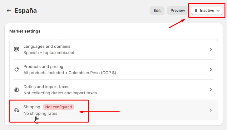 Una vez agregado el mercado nos indica que aún no hay shipping configurado ⬇️