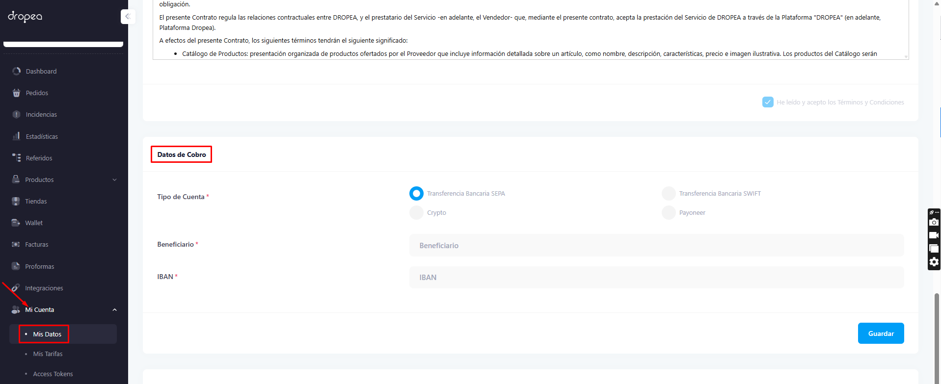 1. Ve a la sección Mi cuenta > Mis datos y busca el bloque "Datos de Cobro"