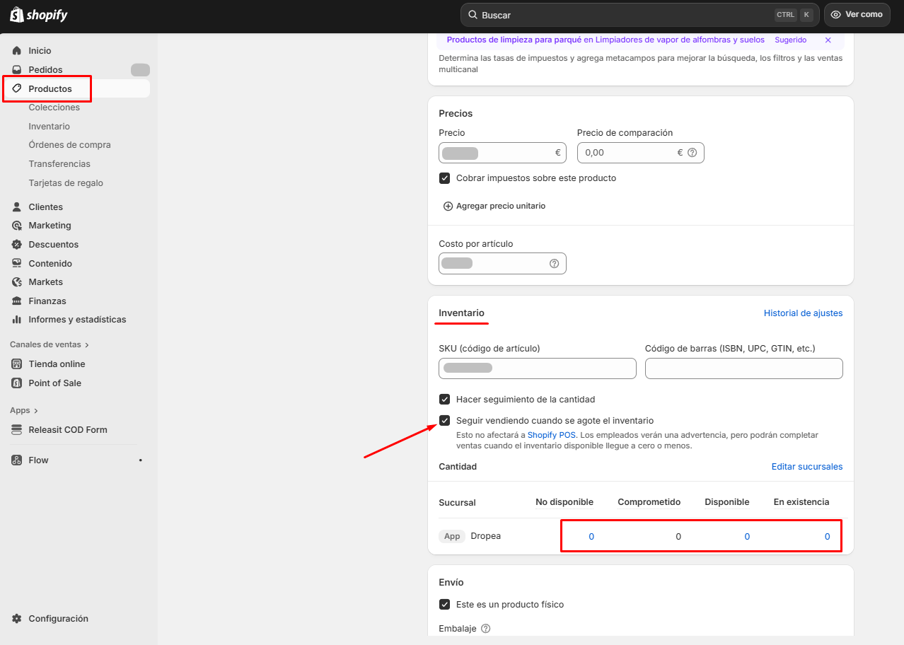 Se dopo aver collegato un prodotto drop al tuo negozio Shopify, il prodotto appare con 0 scorte e la dicitura "ESAURITO" nella landing page, dovresti selezionare l'opzione "Continua a vendere quando le scorte si esauriscono" nel blocco Inventario all'interno del prodotto in Shopify, e questo risolverà il problema.