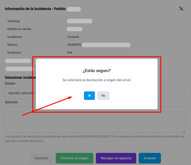 Se precisar devolver um pedido à origem, ou seja, devolvê-lo ao armazém porque o cliente não o receberá, você pode usar o botão "Devolver à Origem" localizado na janela pop-up de resolução de problemas. Após clicar no botão, uma janela pop-up será aberta para que você confirme a ação.